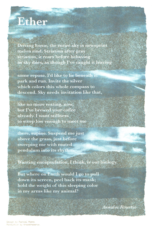 Ether won the Second Annual MU Undergraduate LED Writing Competition. This broadside was produced in an edition of 150 as a publication prize. It features the complete poem.