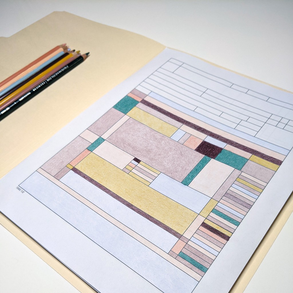 Forms to Color is an adult coloring book with 20 geometric compositions derived from IRS tax forms. Created by Carley Gomez and Levi Sherman 2023 22 unbound letter-size pages Enclosed in a standard manila folder (9.5 × 11.625 in.) Laser printing inside Rubber stamp and adhesive label outside